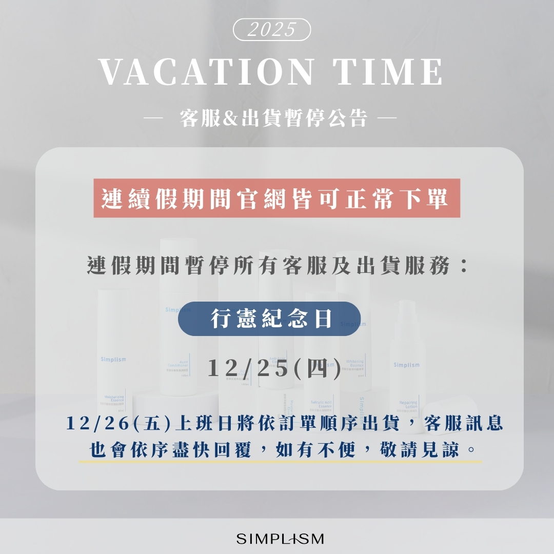 Simplism簡單保養不會以任何名義透過電話、簡訊或Email等方式核對購物資訊、銀行帳戶跟信用卡號等私人資訊,也不會以任何理由(例如:誤設分期付款或連續扣款、誤植訂單、補繳金額、會員升等、取消或變更付款方式等)要求您操作ATM或臨櫃、網路銀行匯款。若您接獲類似電話或簡訊,請立即掛斷並私訊官方FB粉絲團、官方LINE、IG,聯絡簡單保養客服中心,上班時間可撥打 (04)2512-1008 客服電話諮詢查證。