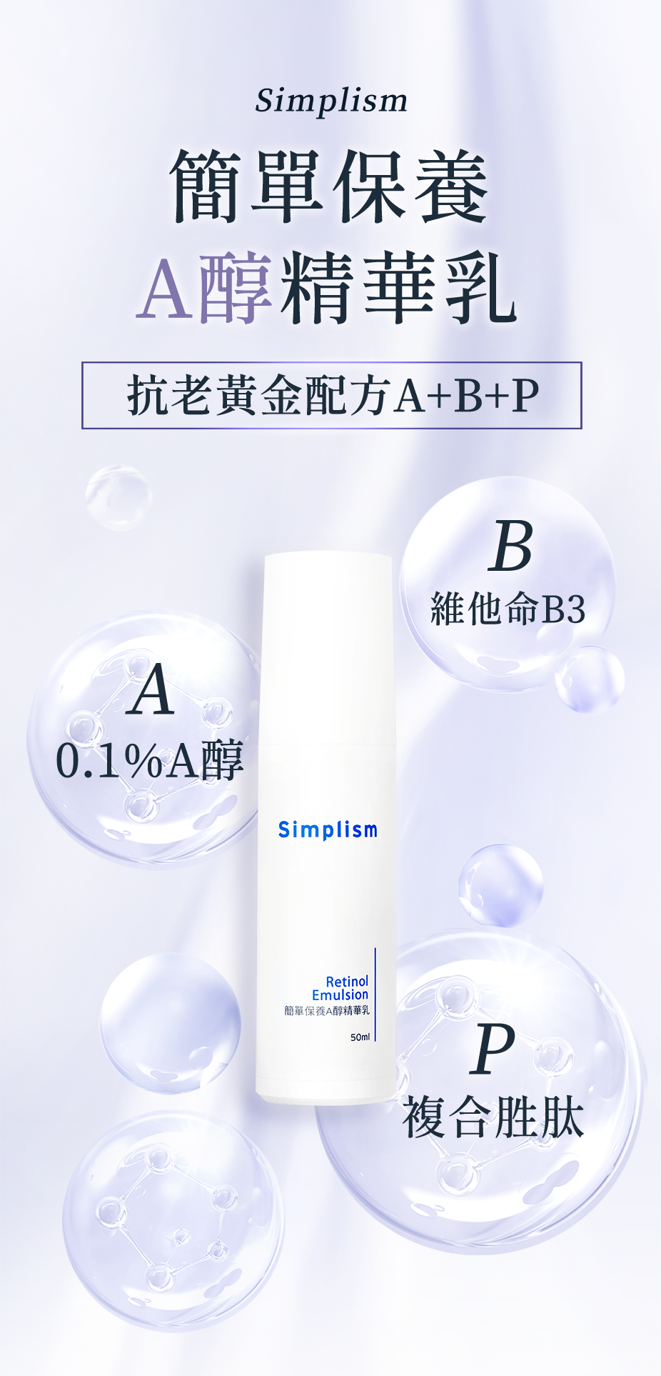 - 主成分:A醇、菸鹼醯胺(維他命B3衍生物)、六胜肽、三胜肽。